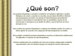 Este documento presenta un resumen de 10 pruebas bioquímicas comúnmente utilizadas para identificar bacterias, incluyendo las pruebas de oxidasa, catalasa, coagulasa, TSI, LIA, IMViC, indol, rojo metilo y sus procedimientos. El objetivo es que los estudiantes aprendan a identificar bacterias aplicando estas pruebas y comparando sus resultados.
