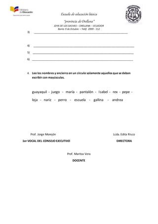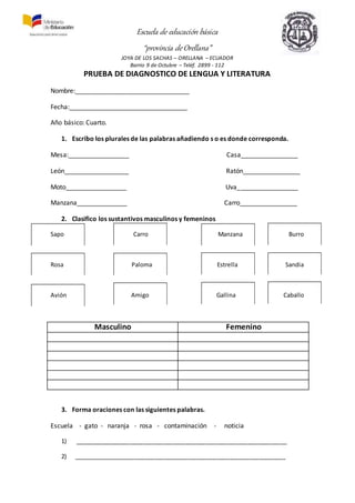 Este documento contiene pruebas de diagnóstico para estudiantes de cuarto año básico en varias materias incluyendo lengua y literatura, matemáticas, estudios sociales y ciencias naturales. Las pruebas contienen preguntas como formar oraciones, completar sucesiones numéricas, identificar partes de plantas y animales, y relacionar conceptos geográficos con Ecuador. El propósito es evaluar el nivel de conocimiento de los estudiantes en diversas áreas académicas fundamentales.