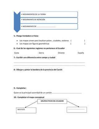 Este documento contiene tres pruebas de diagnóstico para estudiantes de 5to, 6to y 7mo año de una escuela ecuatoriana. Cada prueba incluye preguntas sobre estudios sociales relacionadas con la geografía, historia y cultura del Ecuador. Algunas preguntas requieren completar mapas conceptuales, dibujar banderas o platos típicos, y responder sobre continentes, recursos naturales, y culturas precolombinas como los Valdivia e Incas.