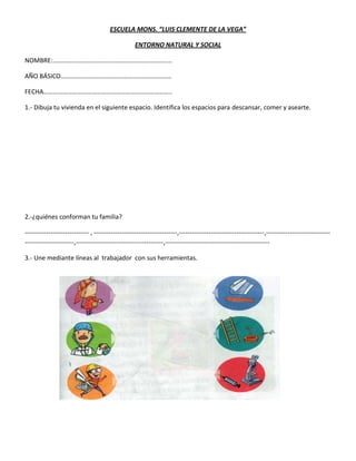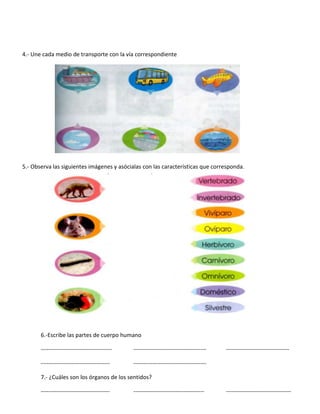 El documento contiene actividades de diferentes asignaturas para estudiantes de primaria. En la sección de matemáticas, hay problemas aritméticos sobre sumas, restas y multiplicaciones. En entorno natural y social, hay preguntas sobre el medio ambiente, símbolos patrios y partes del cuerpo. En lengua y literatura, hay ejercicios sobre género gramatical, sinónimos y trabajos con palabras.