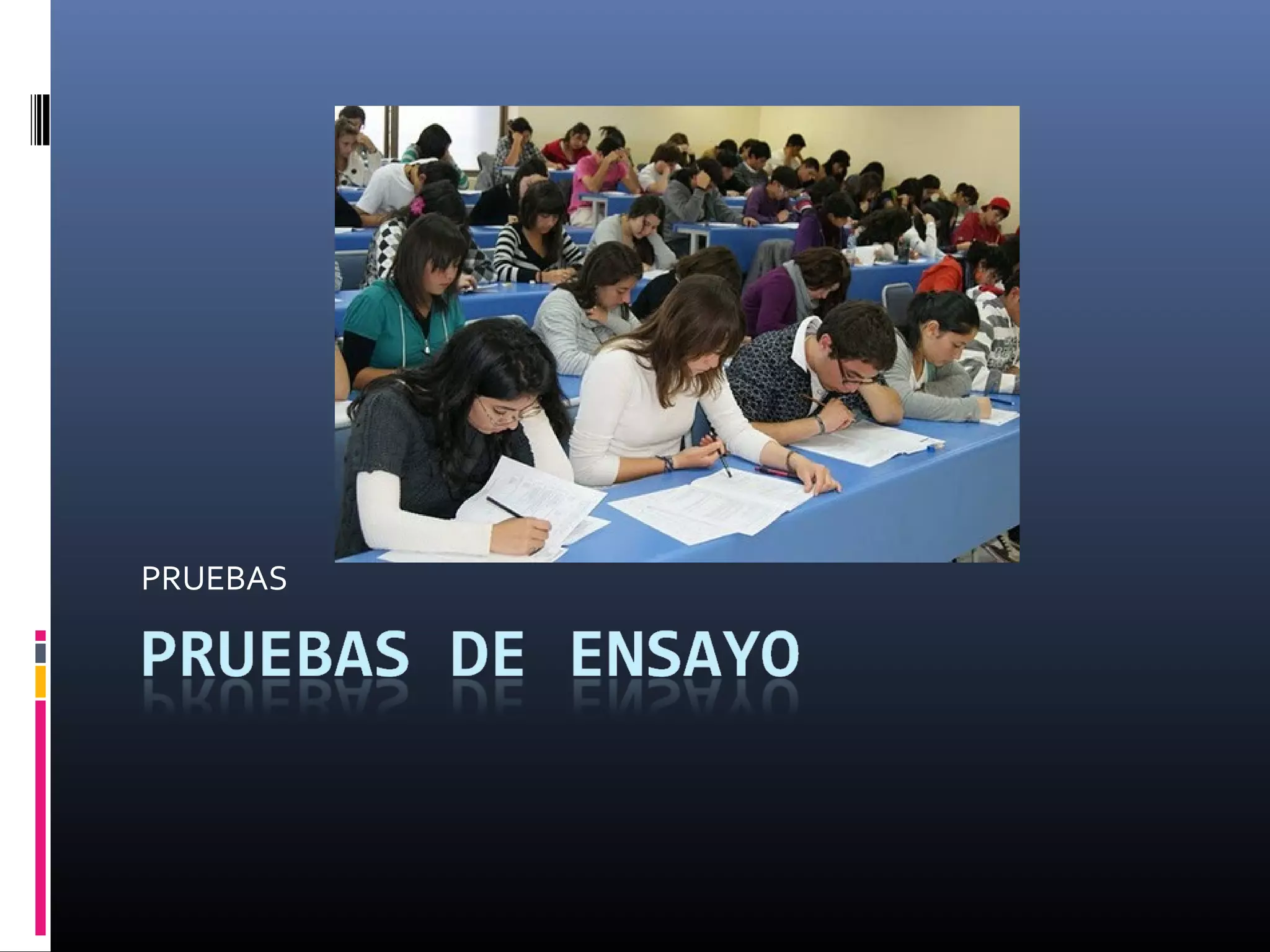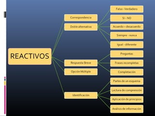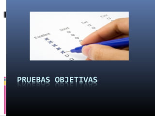 Las pruebas objetivas son instrumentos de evaluación que miden conocimientos y habilidades a través de ítems con una única respuesta correcta. Se caracterizan por exigir respuestas breves y concretas, lo que facilita su corrección y calificación. Dentro de las pruebas objetivas se encuentran los reactivos de doble alternativa, los cuales consisten en enunciados con una palabra errónea que debe ser identificada. Este tipo de reactivos busca eliminar la adivinanza al tener más de dos opciones de respuesta.