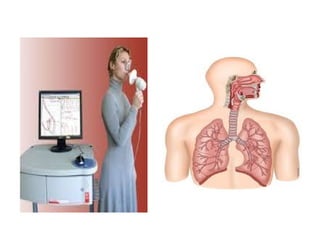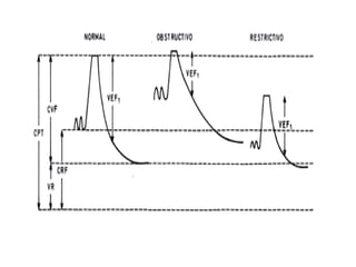 Este documento describe las pruebas de función respiratoria, incluyendo variables estáticas como el volumen corriente y variables dinámicas como el FEV1. Explica los patrones ventilatorios obstructivos, restrictivos y mixtos y cómo se caracterizan. También cubre procedimientos como la espirometría, la pletismografía y la medición de la capacidad de difusión de monóxido de carbono, y cómo estas pruebas ayudan en el diagnóstico de enfermedades pulmonares y extratorácicas.