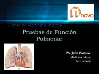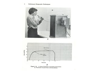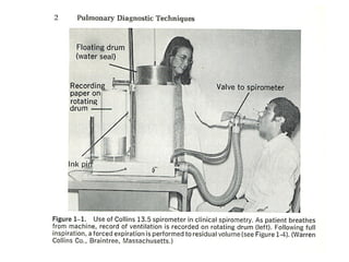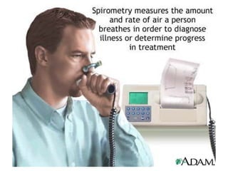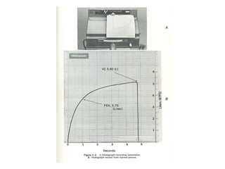 Este documento presenta información sobre la espirometría, una prueba de función pulmonar. Proporciona detalles sobre las indicaciones y contraindicaciones de la espirometría, así como instrucciones para su realización correcta. También describe los patrones ventilatorios restrictivos y obstructivos, y explica cómo la espirometría puede usarse para diagnosticar y monitorear varias enfermedades pulmonares.