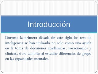 Este documento proporciona una introducción a las pruebas de inteligencia, incluida su historia, definiciones, tipos de pruebas individuales y de grupo, y cómo se clasifican y distribuyen los resultados. Cubre temas como las pruebas de Stanford-Binet, Wechsler, no verbales y de desarrollo infantil, así como el uso de las pruebas para identificar retraso mental y dotación.