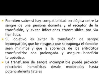 Este documento describe los procedimientos de pruebas de compatibilidad sanguínea realizadas antes de una transfusión de sangre. Explica que las pruebas buscan identificar anticuerpos en la sangre del receptor que podrían causar una reacción hemolítica al transfundir sangre incompatible. También describe los sistemas sanguíneos ABO y Rh, así como las pruebas cruzadas, la prueba de Coombs y otros aspectos relevantes para garantizar la seguridad y eficacia de las transfusiones de sangre.
