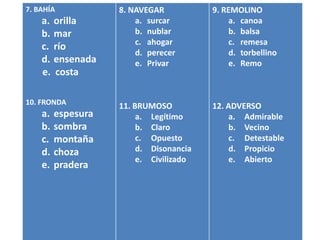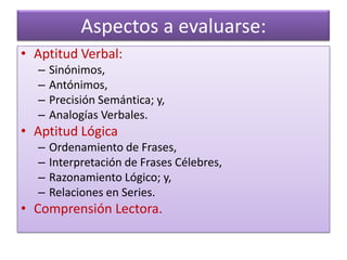 Este documento presenta una serie de ejercicios de aptitud verbal y lógica para evaluar las habilidades de razonamiento. Incluye preguntas sobre sinónimos, antónimos, analogías verbales, frases célebres, razonamiento lógico matemático y series numéricas. El objetivo es medir la comprensión lectora y las habilidades de resolución de problemas de manera concisa en 3 oraciones o menos.