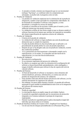 1. Se describen diferentes tipos de pruebas de software, incluyendo pruebas de unidad, integración, validación y del sistema.