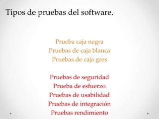 El documento describe diferentes tipos y metodologías de pruebas de software. Explica las pruebas unitarias, donde se prueban módulos individuales; las pruebas de integración, donde se integran módulos probados individualmente; y las pruebas del sistema, donde se prueba todo el sistema interactuando. Finalmente, las pruebas de aceptación se realizan antes de entregar el software al cliente para asegurar que cumple todos los requisitos. Webimprints ofrece este tipo de pruebas de software en México.