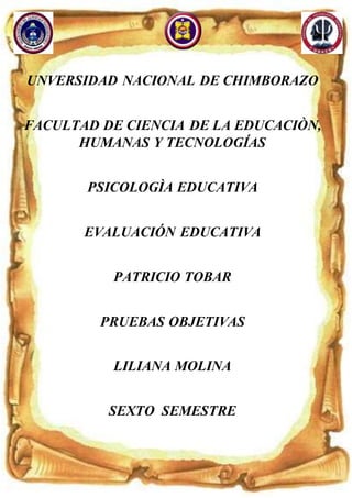 Este documento describe las pruebas objetivas, que son instrumentos de evaluación con respuestas cerradas y una única solución correcta. Explica los tipos de pruebas objetivas, como de respuesta breve, completar, elección múltiple, y ofrece orientaciones para su aplicación y elaboración, como determinar los contenidos a evaluar, formular preguntas claras con una sola respuesta válida, y ordenar preguntas de lo más fácil a lo más difícil.