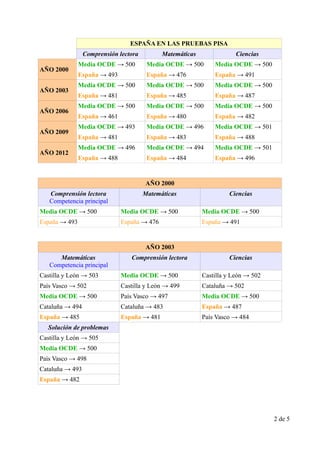 Las Pruebas PISA son exámenes internacionales aplicados cada 3 años a estudiantes de 15 años para evaluar sus habilidades en lectura, matemáticas, ciencias y resolución de problemas. España ha participado desde el inicio y los resultados de sus regiones se comparan con el promedio de la OCDE. Las pruebas más recientes también midieron competencias digitales y financieras.