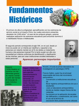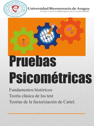 Las pruebas psicométricas tienen sus fundamentos históricos en exámenes antiguos como los de China e Grecia. En el siglo XIX surgieron pruebas para clasificar personas con discapacidad. La teoría clásica de los tests se enfoca en medir con precisión mediante fiabilidad y validez. Cattell desarrolló análisis factorial para identificar los principales rasgos de personalidad a través de cuestionarios y tests objetivos.