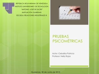 Este documento describe los tipos de pruebas psicométricas y su importancia. Explica que las pruebas psicométricas miden aspectos psicológicos como la personalidad, conocimiento, habilidades y capacidades mentales. Detalla diversos tipos de pruebas como tests de personalidad, coeficiente intelectual, estilo de aprendizaje, y su uso en la selección de personal y evaluación del desempeño. Concluye resaltando que estas pruebas brindan información valiosa de manera objetiva para la toma de decisiones en