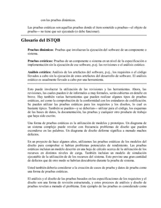 El capítulo 3 se centra en las técnicas estáticas, abordando su importancia en el proceso de pruebas y revisión, diferenciando entre pruebas estáticas y dinámicas. Se destacan las herramientas y procesos de análisis estático, así como los beneficios de las revisiones formales, que incluyen la detección de defectos y la mejora de la calidad del software. Se concluye que las revisiones y análisis estáticos son fundamentales, aunque deben complementarse con pruebas dinámicas para maximizar la eficacia en proyectos complejos.