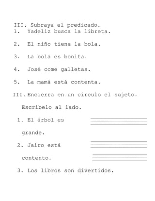 Este documento presenta una prueba con varias secciones para identificar sujetos y predicados en oraciones. La primera sección pide completar oraciones con "sujeto" o "predicado". La segunda y tercera sección piden subrayar el sujeto o predicado en oraciones. La cuarta y quinta sección piden encerrar en círculos el sujeto o predicado y escribirlos. El propósito es practicar la identificación de sujetos y predicados en oraciones.