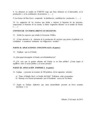 Este documento presenta un examen de economía pública que cubre varios conceptos clave como la eficiencia de Pareto y Keynes, el papel del estado, y artículos relacionados. El examen contiene preguntas de verdadero/falso, preguntas cortas y una sección de aplicación empírica que pide resúmenes de artículos y proyectos de investigación. Evalua los conocimientos fundamentales de economía pública como la asignación de recursos, las funciones del estado y el equilibrio entre los sectores público y privado.