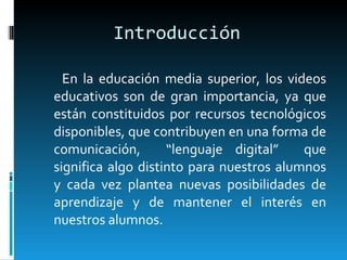 El documento resalta la importancia del uso de videos educativos en la educación media superior, destacando su capacidad para mejorar la comunicación y el interés de los alumnos. Se clasifican diferentes tipos de videos educativos según su propósito, como documentales y lecciones temáticas, y se mencionan sus funciones y ventajas. Además, se describen las fases para la planificación de un video educativo y los aspectos a evaluar.