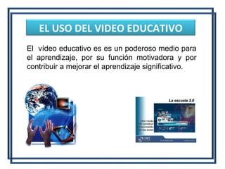 El documento describe los diferentes tipos de videos educativos, incluyendo videos curriculares, de divulgación cultural, científicos y para educación. Explica que los videos educativos pueden proporcionar ventajas como versatilidad, motivación, desarrollo de habilidades críticas y mejor acceso a significados. También discute las funciones de los videos educativos como medio de observación, expresión, autoaprendizaje y ayuda a la enseñanza.