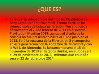 La PlayStation 4 es la cuarta consola de videojuegos de Sony y la sucesora de la PlayStation 3. Fue anunciada en febrero de 2013 y lanzada en noviembre del mismo año para competir con la Xbox One y Wii U. La PS4 cuenta con un procesador de ocho núcleos de AMD y 8GB de memoria GDDR5, y presenta características sociales como compartir videos de juego y transmitir en directo.
