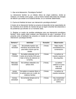 La intervención psicológica familiar es un método clínico sistémico que involucra a la familia como grupo para tratar las energías de relación dentro del sistema familiar. Su objetivo es desarrollar las capacidades de los miembros de la familia para encontrar soluciones a los problemas que enfrentan. El documento presenta un ejemplo de cuadro de estrategias para una intervención de 3 semanas, que incluye entrevistas y terapias con miembros de una familia que sufre violencia, para determinar y tratar los problemas individuales y familiares.