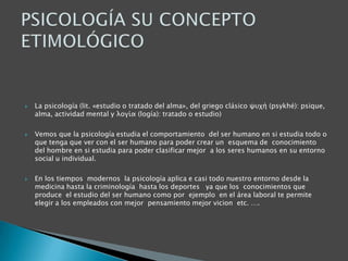 Este documento presenta una breve historia de la psicología. Comienza con los orígenes filosóficos de la psicología en la antigua Grecia con figuras como Sócrates, Platón y Aristóteles. Luego se describe el desarrollo de la psicología a través de la filosofía medieval y moderna, incluyendo pensadores como Santo Tomás de Aquino, John Locke y las teorías del empirismo y asociacionismo. Finalmente, destaca el establecimiento de la psicología como ciencia experimental por