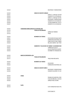 El documento presenta el presupuesto de una obra de evacuación de aguas servidas en la avenida Arequipa hacia un tanque Imhoff en el distrito de Frias, Piura. Incluye partidas para redes de desagüe, buzones, conexiones domiciliarias, un muro de contención y otros como pruebas de calidad de concreto. Se detallan los ítems, unidades, metros cuadrados o cúbicos requeridos, precios unitarios y parciales. El presupuesto total asciende a 131,094.91 nue