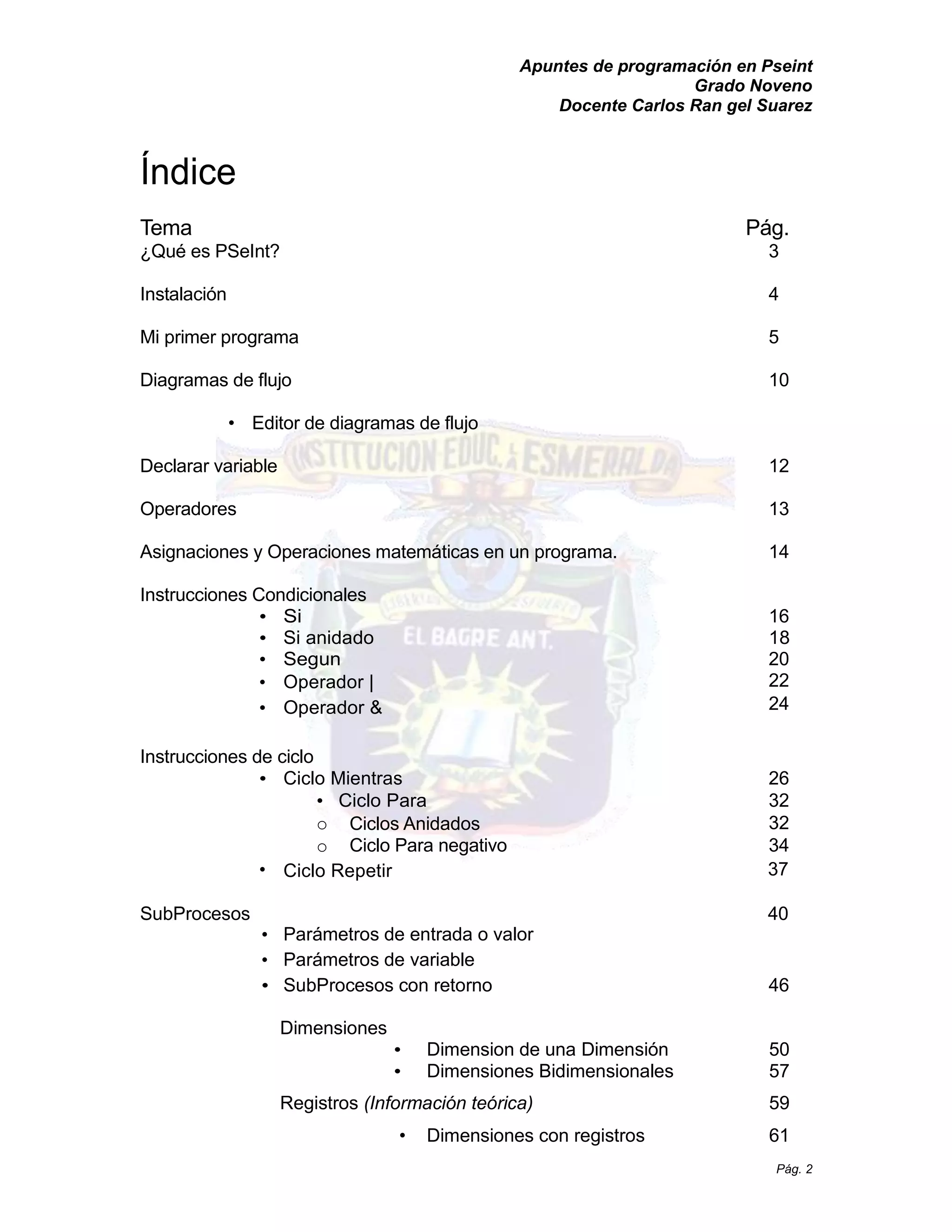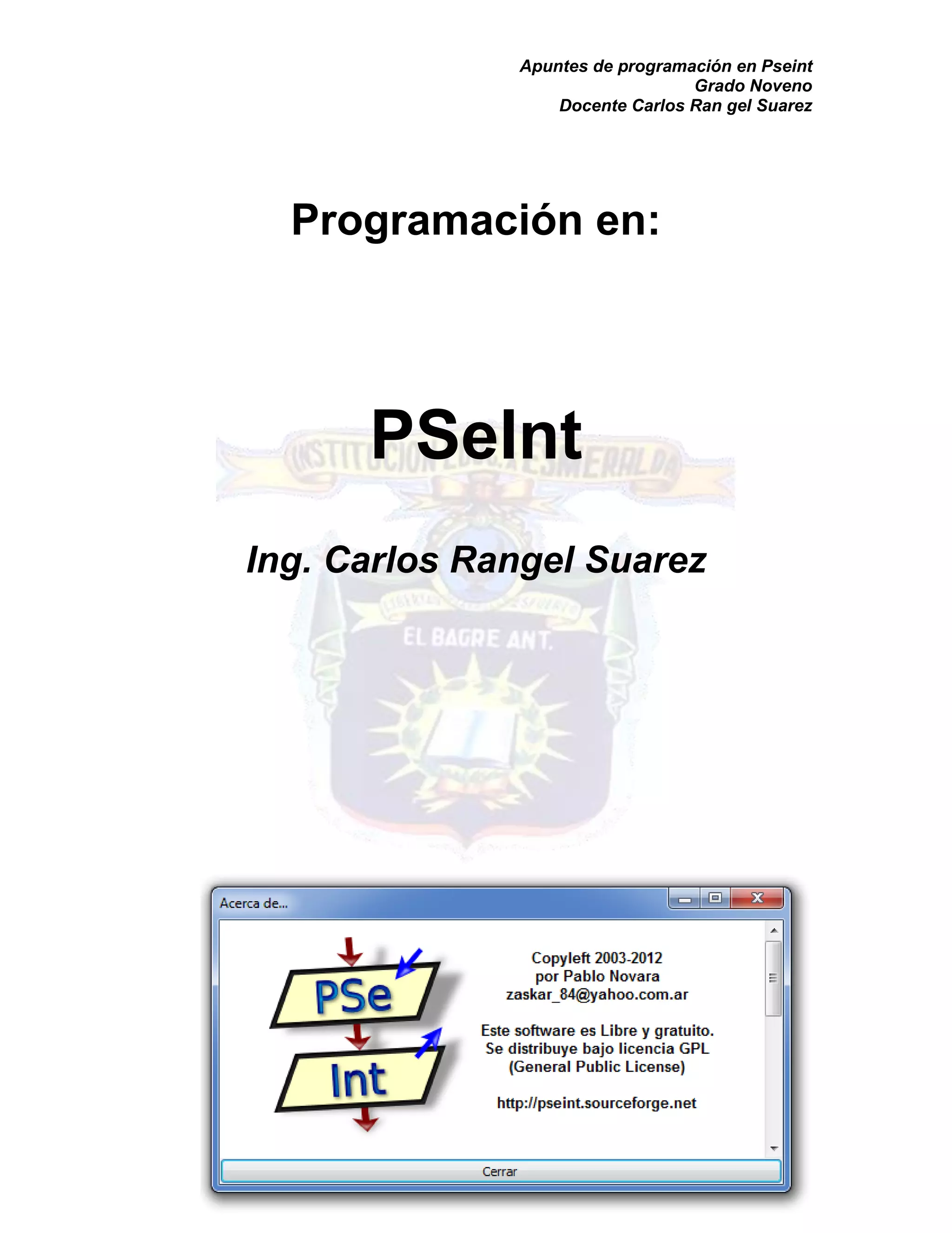 El documento es un manual para aprender a programar utilizando Pseint, un intérprete de pseudocódigo diseñado para facilitar la comprensión de la lógica de programación. Incluye temas como la instalación del software, la creación de programas, el uso de diagramas de flujo, y una variedad de estructuras y operaciones de programación. También se abordan conceptos fundamentales como la declaración de variables, operaciones matemáticas, y estructuras condicionales para tomar decisiones en el código.