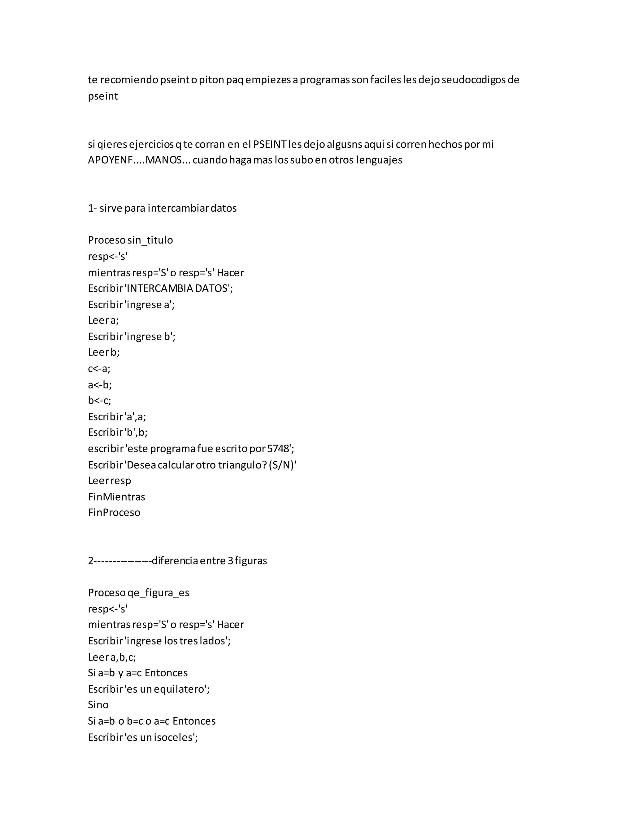Este documento contiene 9 programas en pseudocódigo para realizar diferentes tareas matemáticas y lógicas como intercambiar datos, calcular el tipo de triángulo, determinar si un número es par o impar, calcular promedios, notas de alumnos, aplicar el teorema de Pitágoras, calcular áreas de triángulos, convertir entre segundos, horas y minutos, y determinar si un año es bisiesto. Los programas están destinados a ser ejecutados en PseInt y proveen ejemplos para que los usuarios apre
