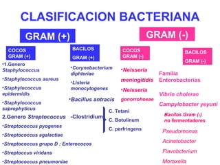 Este documento clasifica y describe varias bacterias gram negativas, incluyendo Pseudomonas aeruginosa. P. aeruginosa es un patógeno oportunista que puede causar infecciones en pacientes inmunocomprometidos, como neumonías e infecciones del tracto urinario. También se describe su hábitat común en el medio ambiente hospitalario y cómo puede causar infecciones en la piel, ojos, oídos y otros sitios.
