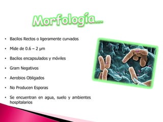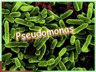 El documento describe características de bacilos gram negativos, como Pseudomonas aeruginosa, que son patógenos oportunistas, especialmente en individuos inmunocomprometidos. Detalla los factores de virulencia de Pseudomonas, sus toxinas y enzimas que causan daños tisulares y enfermedades, así como vías de transmisión. Además, se incluye un caso clínico de un niño de 4 años con infección pulmonar diagnosticada a partir de muestras de moco.