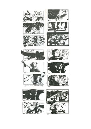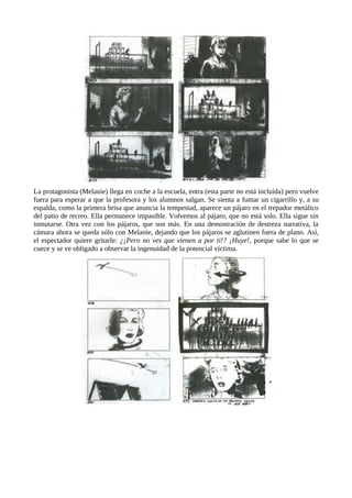 El documento presenta el storyboard de la escena de ataque de pájaros a los niños en la escuela de la película Los pájaros de Alfred Hitchcock. El storyboard muestra con dibujos la llegada de Melanie a la escuela, el aumento gradual de pájaros en el patio y su ataque a los niños cuando salen de clase. El director planeó cuidadosamente la escena mediante el storyboard para crear suspense dejando a los pájaros solos durante 30 segundos antes de mostrar el ataque.