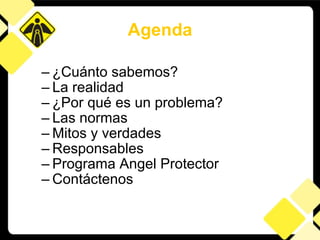 El documento habla sobre los esfuerzos del programa "Angel Protector" para prevenir el consumo de alcohol y tabaco entre menores de 18 años en Colombia. Explica estadísticas sobre el consumo temprano de estas sustancias, los riesgos para la salud de los menores, y las leyes y normas existentes para regular su venta y suministro a este grupo poblacional. También describe los actores involucrados y sus responsabilidades en la prevención del consumo de menores.
