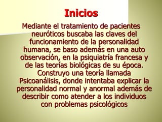 El documento resume las teorías psicoanalíticas de la personalidad de Sigmund Freud. Freud propuso que la mente está dividida en el consciente, preconsciente e inconsciente. La personalidad se compone del Ello, Yo y Superyo, que interactúan para satisfacer instintos de vida y muerte. Freud también describió las etapas psicosexuales del desarrollo y cómo las experiencias en la infancia pueden dar lugar a fijaciones que afectan la personalidad adulta.