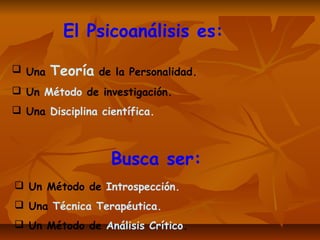 El psicoanálisis es una teoría de la personalidad desarrollada a principios del siglo XX por Sigmund Freud. Se basa en que los trastornos de la personalidad son reflejos de conflictos mentales inconscientes más que de alteraciones físicas. Propone que la mente está estructurada en ello, yo y superyó, y que los impulsos inconscientes influyen en los pensamientos, sentimientos y conducta. Busca ser un método terapéutico y de análisis a través de la introspección.