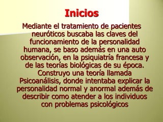 La teoría psicoanalítica de Sigmund Freud propone que la personalidad se forma a través de las etapas psicosexuales del desarrollo. Freud describió la mente como dividida en ello, yo y superyo, y propuso que fuerzas inconscientes como los deseos y los instintos influyen en el comportamiento. Freud también creía que los niños pasan por etapas orales, anales, fálicas y de latencia, cada una centrada en una zona erógena del cuerpo, y que los problemas en estas etapas pueden dar lugar a