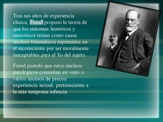 El documento presenta una introducción al psicoanálisis, describiendo cómo la mente expresa sentimientos y deseos de forma inconsciente. Desde la perspectiva de Freud, la mente tiene un componente consciente y otro inconsciente, donde se ubican los instintos e impulsos reprimidos. El psicoanálisis se relaciona con la hermenéutica en cuanto a la interpretación de la cultura y la comprensión del hombre. Analiza también la relación entre psicoanálisis y literatura, señalando cómo Freud encontró en obras literari