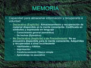 Este documento resume los diferentes tipos de memoria, incluyendo memoria declarativa vs no declarativa, memoria a corto vs largo plazo, y los modelos modulares y neuropsicológicos de la memoria. También describe casos de amnesia como los de los pacientes H.M., N.A. y R.B., y las enfermedades de Alzheimer y síndrome de Korsakoff.