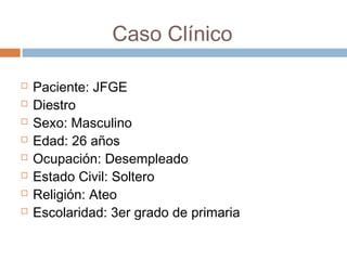Este documento presenta el caso clínico de un paciente de 26 años de edad con diagnóstico de esquizofrenia desorganizada y trastorno de agresividad que han sido refractarios a tratamiento médico y terapia electroconvulsiva. Se describe el historial del paciente y sus síntomas. Los estudios de gabinete y de neuroimagen se muestran. Finalmente, el paciente es sometido a una psicocirugía que involucra trepanos frontales bilaterales y leucotomía prefrontal.