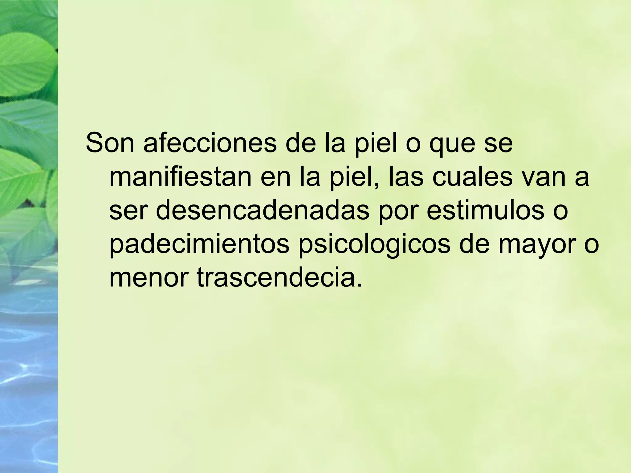 El documento describe varias psicodermatosis como la urticaria, dermatitis atópica, psoriasis, alopecia areata y otras afecciones de la piel asociadas a factores psicológicos como el estrés, ansiedad y depresión. También describe síntomas, signos y posibles desencadenantes de cada una.