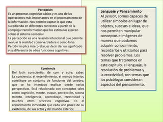 Este documento resume varios conceptos clave relacionados con los procesos mentales. Brevemente describe la percepción como un proceso cognitivo básico que nos permite captar estímulos y darles significado. También habla sobre la conciencia como el conocimiento inmediato que tenemos de nuestra existencia y del mundo exterior. Además, explica que el lenguaje y el pensamiento nos permiten manipular conceptos e ideas mediante el uso de símbolos para adquirir conocimiento y resolver problemas. Finalmente, resume el funcionamiento del sistema nervioso simpático y