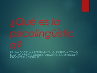 Este documento presenta una introducción a la psicolingüística, incluyendo una definición de la disciplina, una descripción de cómo se estudia el lenguaje a diferentes niveles (fonético, léxico, morfológico, sintáctico, pragmático y metalingüístico), y ejemplos de temas investigados en cada nivel, como la adquisición del sistema fonológico, la organización de palabras en la mente, y el desarrollo de habilidades metalingüísticas en los niños.