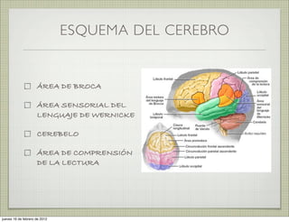El documento describe las principales áreas del cerebro relacionadas con el lenguaje y la función del lenguaje. Explica que el lenguaje se ubica fundamentalmente en el hemisferio cerebral izquierdo, con las áreas de Broca y Wernicke jugando un papel clave. También discute cómo la evolución del lenguaje articulado, la gramática y la capacidad de leer y escribir emergieron a lo largo del tiempo.