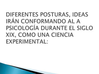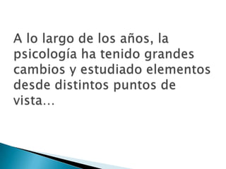 Este documento presenta un resumen de la evolución histórica de la psicología como disciplina científica. Comienza analizando las diferentes concepciones del alma a lo largo de la historia. Luego describe el surgimiento de la psicología como ciencia independiente de la filosofía y su desarrollo hacia enfoques empiristas y conductistas que buscaban objetivar y medir experimentalmente los procesos mentales. Finalmente, presenta las principales teorías y experimentos conductistas sobre el aprendizaje y la modificación de la conducta a través