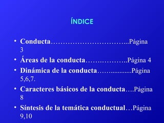 Este documento trata sobre la conducta humana. Explica que la conducta son las acciones que una persona realiza en relación con su entorno, manifestándose como la búsqueda de equilibrio entre las necesidades del individuo y las posibilidades que le brinda el medio. Las conductas se dividen en dos dimensiones: la exterior, observable, y la interior, no observable pero presente en los pensamientos. La conducta de una persona se refleja a través de su cuerpo, relaciones sociales y expresiones mentales, y depende de su personalidad.