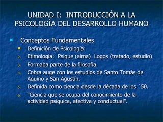 El documento presenta una introducción a la psicología del desarrollo humano. Define la psicología y su relación con otras ciencias. Explica conceptos como emoción, conducta y personalidad. Describe las principales escuelas de pensamiento como el psicoanálisis, conductismo y fenomenología. Finalmente, resume teorías del desarrollo como las de Freud, Erickson, Piaget y el debate sobre la influencia de la naturaleza versus la crianza.