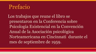 Este documento presenta un resumen de varios capítulos de un libro sobre psicología existencial. El libro reúne trabajos presentados en una conferencia sobre psicología existencial en 1959. El primer capítulo describe el surgimiento de esta corriente y sus principales exponentes como Kierkegaard. El capítulo de Maslow analiza las contribuciones de la filosofía existencial a la psicología humanística, como una visión del hombre basada en sus potencialidades. El capítulo de May presenta seis principios ontológicos que sirven de base