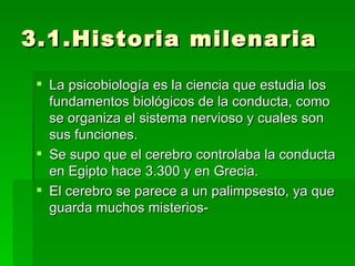 Este documento resume los fundamentos biológicos de la conducta, incluyendo la historia, genética y estructura del sistema nervioso. Describe la evolución de las neuronas, las divisiones del sistema nervioso central y periférico, las funciones del cerebro y las glándulas endocrinas como la hipófisis, tiroides y suprarrenales. También cubre los métodos de exploración cerebral y las diferencias en el cerebro masculino y femenino, así como algunas patologías cerebrales.