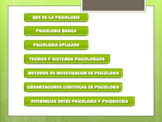 Este documento presenta un resumen de los principales temas de la psicología, incluyendo definiciones de psicología básica, aplicada y diferentes campos como la psicología del aprendizaje, evolutiva, de la personalidad, clínica, educativa y organizacional. También describe teorías como el psicoanálisis, conductismo, cognitivismo, humanismo y psicobiología, así como métodos de investigación e historia de la disciplina.
