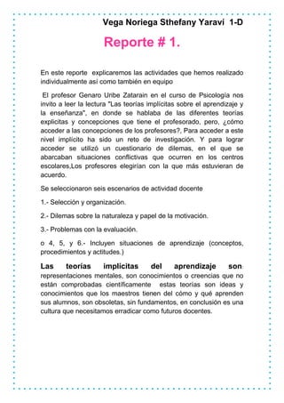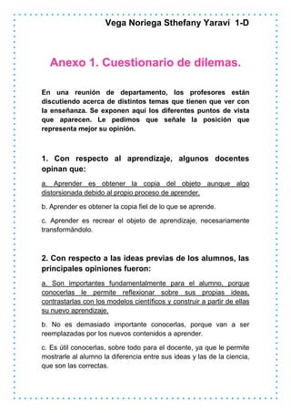 El documento resume los resultados de un cuestionario de dilemas docentes completado por estudiantes. La mayoría de las respuestas de los estudiantes se alinearon con la teoría constructivista del aprendizaje. Al analizar los resultados en grupo, los estudiantes concluyeron que deben eliminar las teorías implícitas de su práctica docente para mejorar la calidad de la educación.