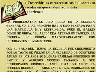 El documento describe una escuela primaria ubicada en un barrio que experimentó un crecimiento poblacional. La escuela enfrenta problemas como baja matrícula, altas tasas de repitencia y ausentismo. Los docentes implementaron capacitaciones para abordar estos problemas y mejorar los aprendizajes de los estudiantes, considerando el contexto social del barrio.