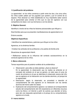 El documento trata sobre el tema de la agresividad. Explica que la agresividad puede ser de tipo físico, verbal o no verbal y que es una reacción normal pero es importante saber controlarla. Identifica algunas causas de la agresividad como problemas familiares o una excelente memoria para recordar problemas del pasado. Describe características de la agresividad como conductas apoyadas por otros durante la infancia. Finalmente, presenta un marco referencial para analizar la problemática incluyendo observación, descripción y explicación del comportamiento agresivo.